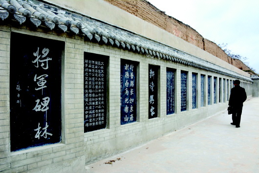 中岔古堡一堡三院,分為前院、中院、后院。走進古堡,堡門左側建有戲樓,上書“中岔劇場”四字。戲樓(又稱戲臺)始建于清光緒年間,上世紀六七十年代曾重修過。近堡門處右側堡墻下修建有兩處一體化的石碑長廊一直通向后院,碑廊中石碑一塊接著一塊砌筑在青磚墻內,石碑與石碑之間以青磚分隔,上覆筒瓦和滴水防護,每一通石碑上都刻有中華人民共和國將軍書寫的一幅書法作品。第一通石碑上甘谷籍將軍張臣剛書寫的“將軍碑林”四字分外醒目,劉精松、邢世忠、裴懷亮、李乾元等數(shù)十位叱咤風云的共和國將軍書寫的書法碑刻依次嵌進墻內,組成一個氣勢磅礴、雄偉壯觀的將軍書法長廊,這就是新建的將軍碑林。