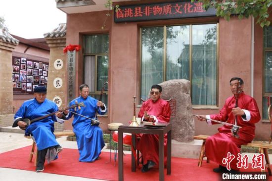 10月12日,甘肅省定西市臨洮縣舉行非物質(zhì)文化遺產(chǎn)展示中心啟動儀式。圖為當(dāng)?shù)仄び皯騻鞒腥粟w學(xué)兵(右二)帶領(lǐng)班社表演影子腔。 張婧 攝
