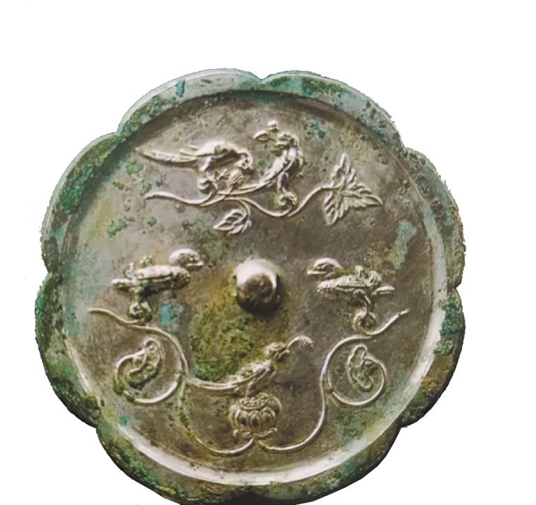 隋唐時期是中國封建政治經(jīng)濟文化高度發(fā)展繁榮的時期,唐代社會經(jīng)濟全面發(fā)展,手工業(yè)各部門也都興旺發(fā)達,青銅鑄造業(yè)中的銅鏡業(yè)尤為突出,無論造型、題材、紋飾、鑄造工藝,都突破了前代的模式,達到了中國古代銅鏡藝術的巔峰。唐鏡鏡型厚實,方形鏡、菱花形鏡、葵花形鏡流行;紋飾題材多見瑞獸、飛鳥以及葡萄、花草等;瑞獸葡萄鏡最具特色,是中西文化融合的杰作。