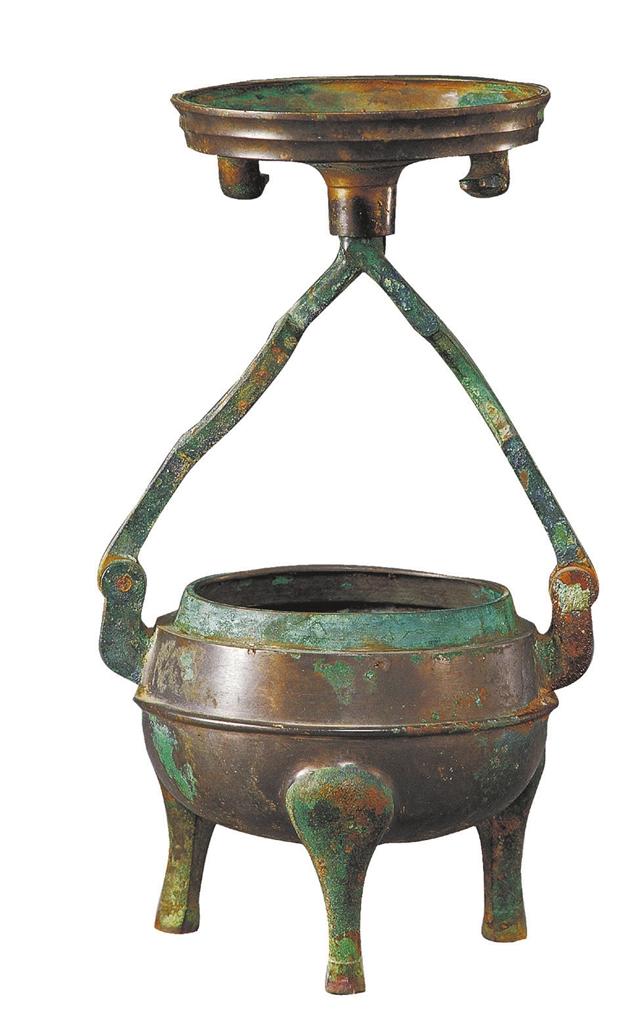 一件收藏在甘肅省博物館的戰(zhàn)國時期的“鼎形銅行燈”,1974年出土于平?jīng)鍪械膹R莊。乍一看,這件銅器不像燈,更像只銅香爐。不過,在古人的眼中,它不像銅香爐,而像只三足圓鼎,三足、鼓腹、兩耳……可這只鼎高僅16.7厘米,口徑為11.3厘米,哪有這么小的鼎呢?至多是個大香爐罷了。不忙,你瞧,這只“鼎”蓋中央有一突出的圓柱狀銎(qióng),蓋兩側(cè)為相對的二鴨首,其寬嘴正好銜住雙鍵,鼎蓋被雙鍵牢牢地扣著。輕輕地支起雙鍵,然后翻轉(zhuǎn)鼎蓋將圓柱狀銎插入雙鍵,一個精巧別致的銅燈就出現(xiàn)了:鼎蓋是碟狀的燈盞,倒入燈油,放上燈芯,點(diǎn)亮——用完了,把鼎蓋的余油倒回鼎內(nèi),收回雙鍵,合上鼎蓋,再扣好——嚴(yán)密得滴油不漏。