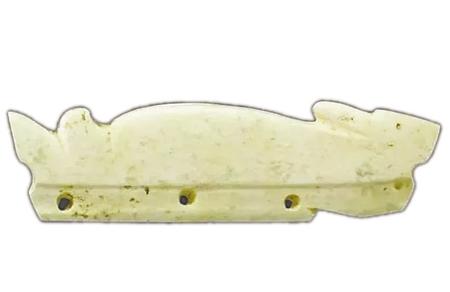 目前所見最早的玉兔有安徽含山凌家灘遺址出土的兔形飾件,其屬于凌家灘文化,距今5300年。該玉料受沁呈黃白色,飾件由兔形的上部和榫形的下部組成,兔呈伏臥狀,但無足部表現(xiàn),嘴前伸,耳朵向后伸,背部呈弧形上凸,尾巴既似兔子又若魚,上翹分叉;榫部長條形,上面對鉆成四孔。