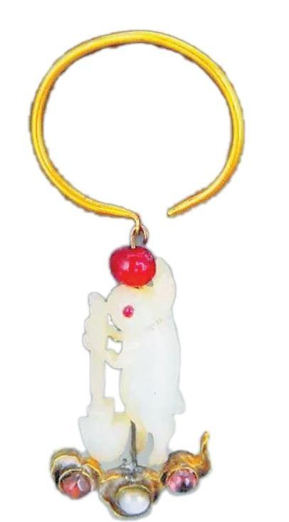 北京市昌平區(qū)十三陵定陵地宮明代定陵孝靖皇后的棺內(nèi),有一對金環(huán)鑲寶石玉兔耳墜。該金環(huán)鑲寶石玉兔耳墜中,兔子直立,雙耳上豎,玉色青白細潤,以紅寶石嵌飾雙眼,兩前爪抱杵作搗藥狀,下有臼,兔身上以細密陰線刻出毛發(fā)。