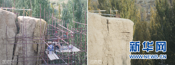 敦煌研究院古代壁畫(huà)與土遺址保護(hù)創(chuàng)新團(tuán)隊(duì)承接的新疆交河故城崖體加固項(xiàng)目前后效果對(duì)比(資料圖)。敦煌研究院 供圖