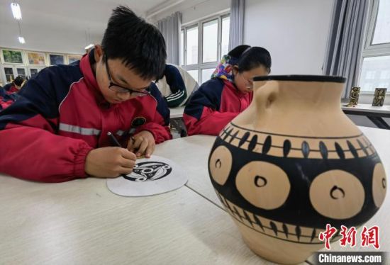 近日,中新社中新網(wǎng)記者走進(jìn)蘭州市第三中學(xué)“彩陶”課堂,學(xué)生正在繪制彩陶圖案。 劉玉桃 攝