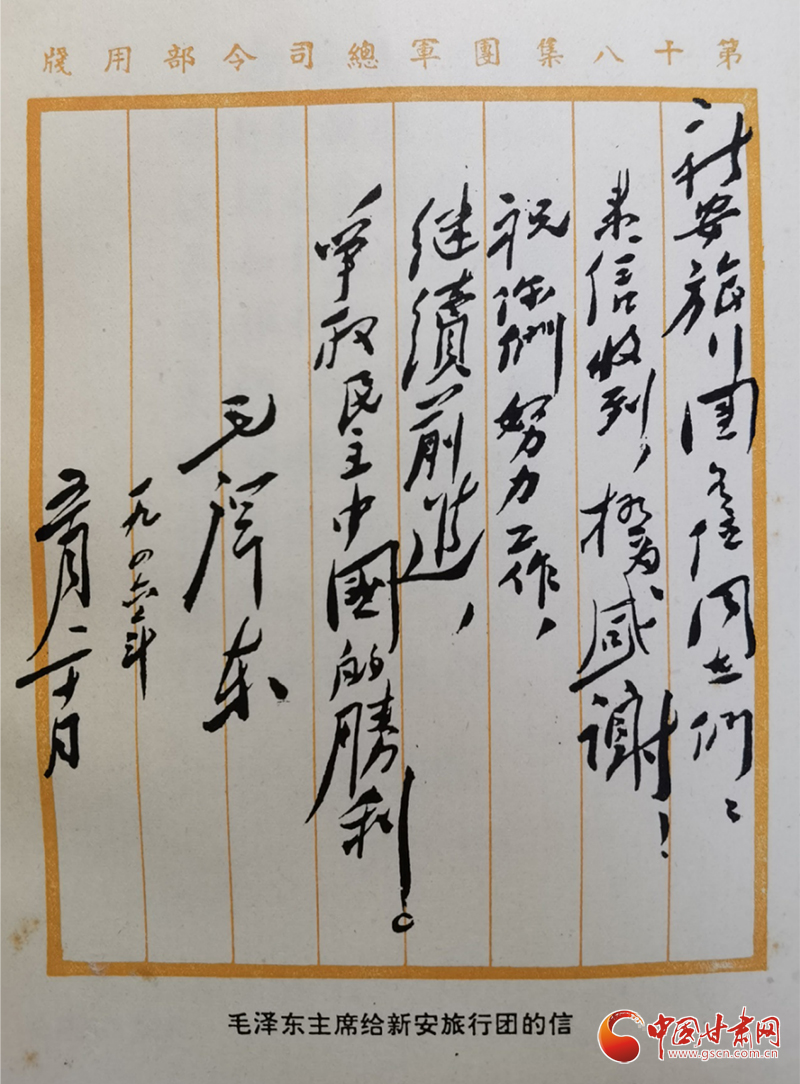 1946年5月20日,毛澤東主席給新旅回信:“新安旅行團(tuán)各位同志們:來信收到,極為感謝!祝你們努力工作,繼續(xù)前進(jìn),爭取民主中國的勝利。”時(shí)隔75年后的2021年5月30日,習(xí)近平總書記給新安小學(xué)的少先隊(duì)員們回信:“當(dāng)年,在黨的關(guān)懷和領(lǐng)導(dǎo)下,‘新安旅行團(tuán)’不怕艱苦,足跡遍及大半個(gè)中國,以文藝為武器,喚起民眾抗日救亡,宣傳黨的主張,展現(xiàn)了愛國奮進(jìn)的精神風(fēng)貌。希望你們結(jié)合自身成長實(shí)際學(xué)好黨史,以英雄模范人物為榜樣,從小堅(jiān)定聽黨話、跟黨走的決心,刻苦學(xué)習(xí),樹立理想,砥礪品格,增長本領(lǐng),努力實(shí)現(xiàn)德智體美勞全面發(fā)展。”