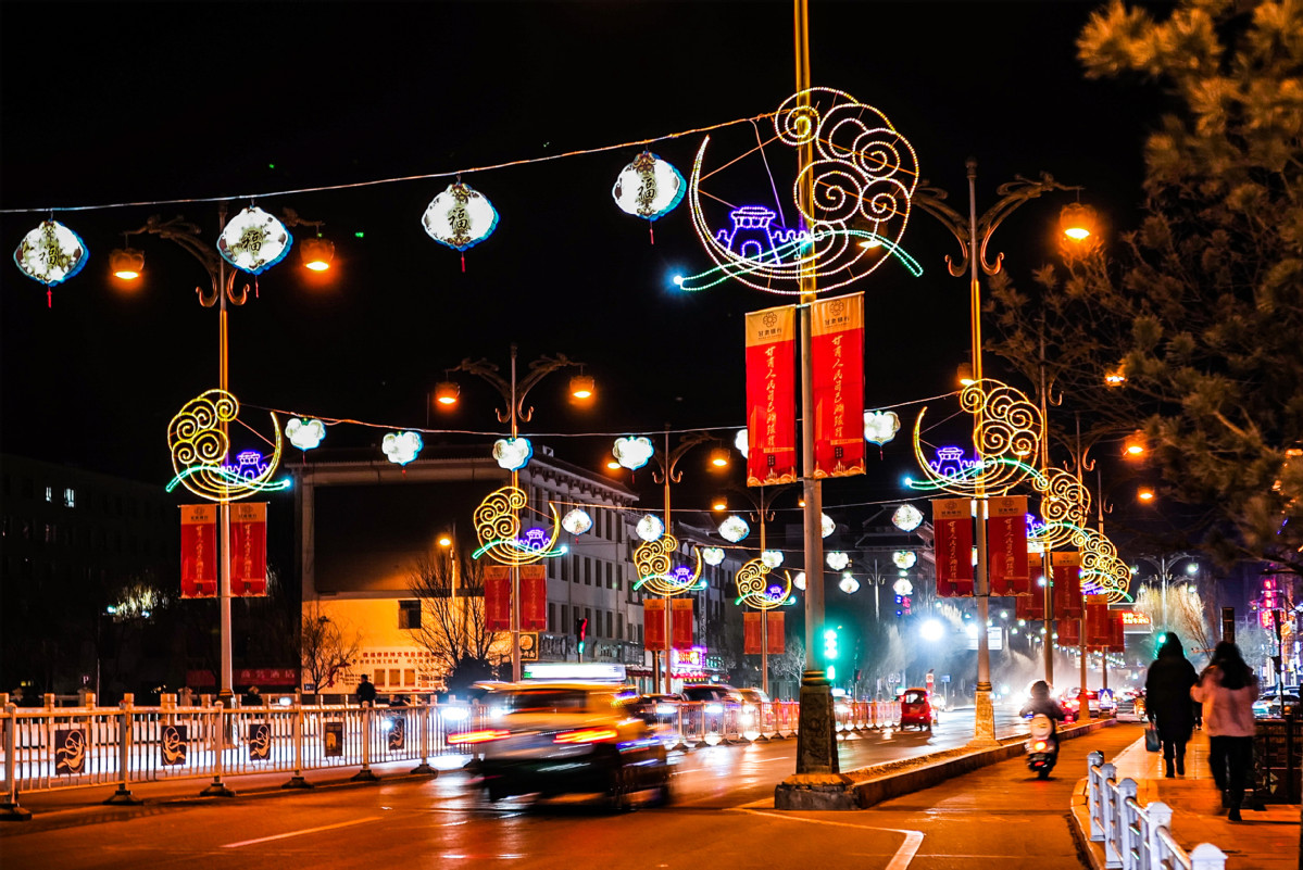 1月25日晚,甘肅省敦煌市“人類敦煌·心向往之”2022年新春文化燈展布置完成并亮燈,古郡敦煌大街小巷燈火輝煌,文化彩燈點(diǎn)亮古郡夜空。