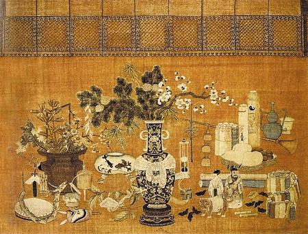 明代陸治的《歲朝圖》可以說是入門級別的標(biāo)準(zhǔn)范本。白釉冰裂紋貫耳瓶中插梅、茶、天竹,乳釘弦紋盆中植水仙。盆花前是百合、柿子、如意組成的百事如意組合,如意后方的盤中盛穗,又合作歲歲如意。