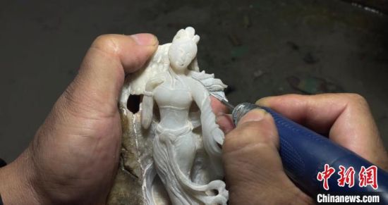 圖為玉雕手藝人李學(xué)平正在進(jìn)行飛天人物的雕刻。 高瑩 攝