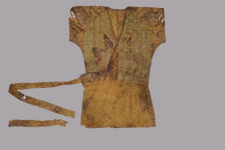 而在墓葬清理過程中,項目組經清理確認慕容氏墓棺木保存完整,棺內見人骨一具,仰身直肢。墓主身著唐朝官服,頭枕雞鳴枕,挽髻,戴巾子并簪金釵,頭套金質下頜托,面罩絲織覆面,腰束嵌金蹀躞帶,身前放置象牙笏板,蓋絲質衾褥,身旁放置有盤、碗、碟、筷、勺、胡瓶等餐飲器具;筆、墨、紙、硯等文房用具;漆奩、鏡衣、粉盒、骨笄、木梳等梳妝用具;嵌金匕首、豹皮弓韜、貼金花漆木胡祿等武器裝備。墓主身著絲織衣物多達十四層,其內包括絹、綺、綾、錦、羅、紗、緙絲等傳統(tǒng)絲織品種類兼?zhèn)?;團窠紋、對獅紋、翼馬紋、對鹿紋、鳳紋、麒麟紋等唐代絲織品紋樣兼?zhèn)?;夾纈、扎染、刺繡等唐代絲織品制作工藝兼?zhèn)?,為國內外所罕見?/p>