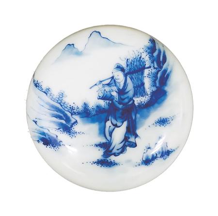一件是青花印泥盒,制作于20世紀初。直徑7厘米,高3厘米,盒身扁圓,鼓腹,上下相合。盒蓋用青花繪“樵夫讀書”圖。畫面遠處,兩座山峰高聳云間,四周樹木蔥蘢,山石嶙峋。畫面正中的山路上,一樵夫砍柴歸來,身背一大捆柴草,他右手扶著木棍,左手則捧著一本書,雙眼盯著書本,緊抿嘴唇,正津津有味地邊走邊讀。讀到精彩處,露出會心一笑??磥?,這個樵夫是極愛讀書的,這種好學精神,難道不值得我們學習嗎?這件瓷印泥盒,青花色澤典雅,人物衣褶神態(tài)描繪細致,栩栩如生,胎體堅致,白釉溫潤,層次清晰,保存完好。