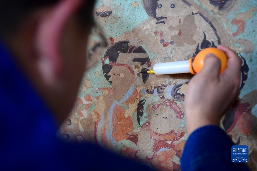 4月19日,在莫高窟第231窟,楊金禮在修復出現(xiàn)病害的壁畫。新華社記者 杜哲宇 攝