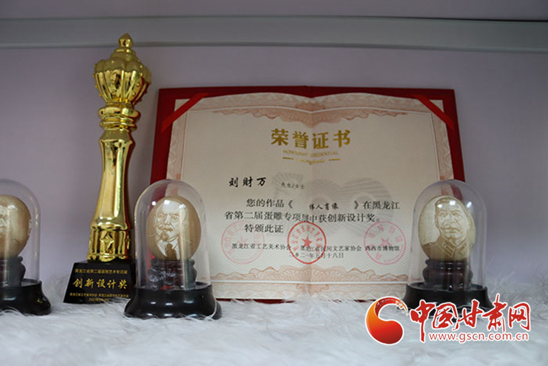 記者在采訪中注意到,社區(qū)的展柜一角擺放著不少獲獎證書,其中一張是在2021年的全國蛋雕專項展上,為劉財萬作品《偉人肖像》頒發(fā)的創(chuàng)新設(shè)計獎證書。“目前正在為全國蛋雕藝術(shù)聯(lián)展作準備”,當記者問起下一步打算時,劉財萬顯得信心十足。