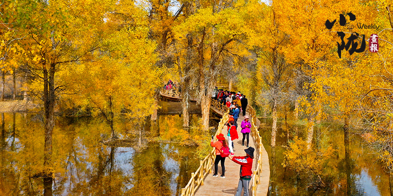 漫步林中,就仿佛進(jìn)入神話中的仙境。茂密的胡楊干奇百怪,神態(tài)萬般。粗壯、滄桑的胡楊幾個人難以合抱,挺拔的有七八丈之高,怪異的似蒼龍騰越、虬蟠狂舞。每一棵高大的樹冠枝頭,間或又有淺綠、淡黃的葉片在閃現(xiàn),錯落有致,色彩繽紛,滿眼的赤橙黃綠與盈盈秋水互相映襯,令人嘆為觀止?!?/p>