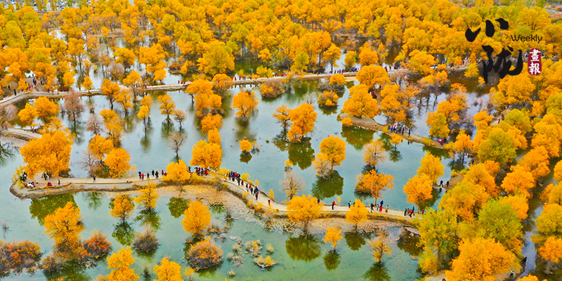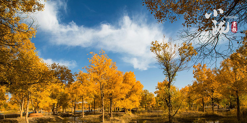 秋風(fēng)起時,一樹金黃在湛藍(lán)的天空下連綿不絕,映著湖面,和流云飄逸的藍(lán)天一起,綻放成一幅壯麗的圖景。
