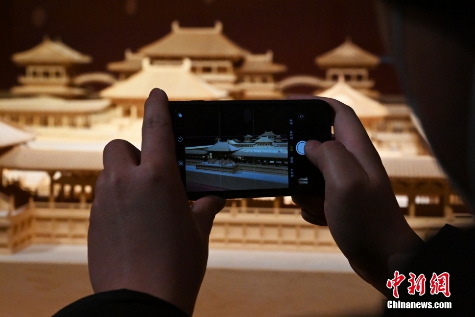 游客正在拍攝“千年營造——敦煌壁畫中的建筑之美”特展上的佛寺建筑群模型。