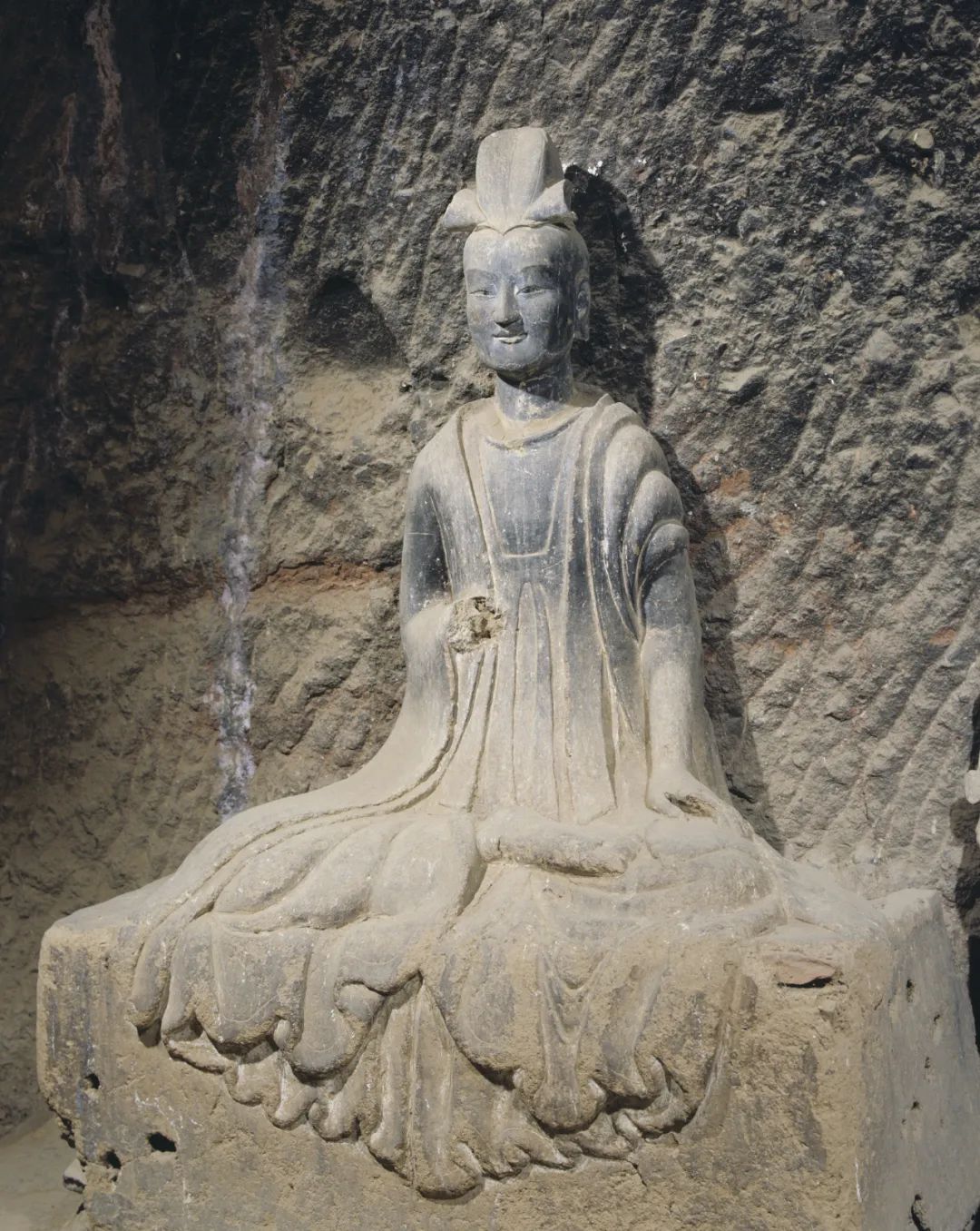 從題材上看,以單尊佛、菩薩、力士等為主,風(fēng)格上更具有寫實(shí)性。造像面相橢圓飽滿,斜眉吊目,懸鼻小口,表情森嚴(yán)、凝重,服飾簡潔、質(zhì)樸,寬博厚重,極富質(zhì)感。其中佛低平螺髻,前置肉髻珠,身穿垂領(lǐng)袈裟。菩薩束發(fā)高髻或戴風(fēng)帽,眉目慈祥,身材比例協(xié)調(diào)、準(zhǔn)確。力士表情生動(dòng)傳神,體形孔武雄健,充滿陽剛之氣,給人以強(qiáng)烈的力量和威武感;這段時(shí)間造像前衰后盛也與當(dāng)時(shí)秦州所處環(huán)境有密切關(guān)系。