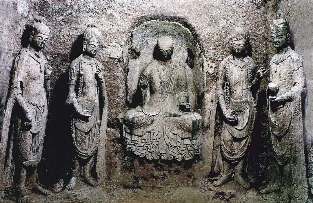它一改西魏造像繁縟華麗、服飾厚重的特點(diǎn),無論是佛、菩薩、弟子,還是飛天和力士,服飾輕柔而貼體,均展現(xiàn)出一種雄健挺拔、恬靜自然的氣韻,面相方圓,五官清秀而緊湊。佛低平肉髻,身穿圓領(lǐng)通肩或垂領(lǐng)式袈裟,衣裾下擺緊貼佛座,陰刻圓潤流暢的褶皺紋。菩薩也由束發(fā)高髻改為頭戴花冠,周身飾瓔珞,體姿婀娜而不失端莊。