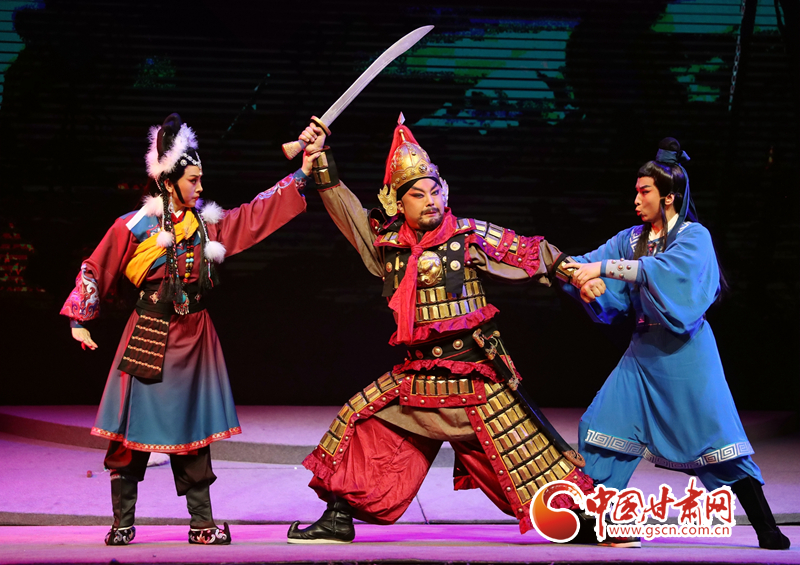隴劇《敦煌》以回鶻族公主格麗莎的命運(yùn)軌跡為結(jié)構(gòu)框架和發(fā)展脈絡(luò),描繪了一幅炎黃子孫在血與火的洗禮中,保護(hù)中華民族文化的宏偉畫(huà)卷,充分詮釋了敦煌文化“美人之美”“美美與共”的開(kāi)放胸襟,“止戈為武”“協(xié)和萬(wàn)邦”的和平思想,“和為貴”“和而不同”的東方智慧以及“自強(qiáng)不息”的奮斗精神、“舍生取義”犧牲精神。