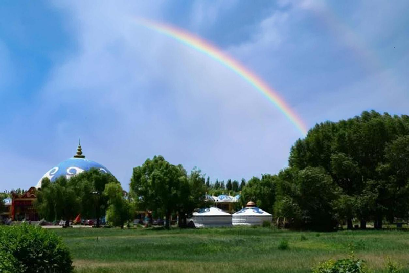 余每遙望心儀卻不能至的彩虹,常憶陸游《秋思》詩句:“天際掛虹初斷雨,云頭翳日又成陰。”秋游包頭賽汗塔拉(1),卻出人意料地邂逅可望亦可即的彩虹。經(jīng)當(dāng)?shù)赜讶艘I(lǐng)乘興疾步入彩虹落腳處,大異既往定見,歸作以志其趣。