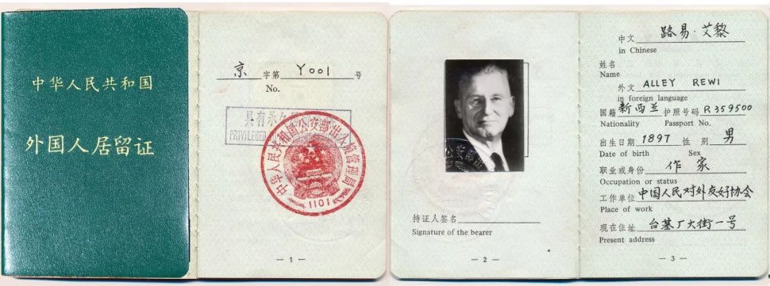 路易·艾黎的外國人居留證