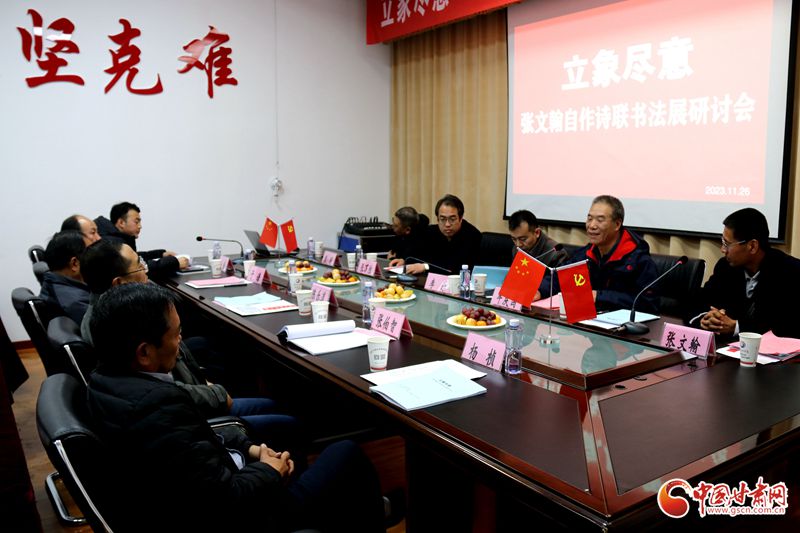 11月26日下午,“立象盡意——張文翰自作詩聯(lián)書法展研討會”在華夏文明導報社舉行。甘肅省委宣傳部文藝處處長李樂,中國作家協(xié)會會員、甘肅省作家協(xié)會副主席牛慶國,中國書法家協(xié)會會員,甘肅省書法家協(xié)會副主席張萬勝出席研討會,來自蘭州大學、西北師范大學的教授、學者20余人參加會議。