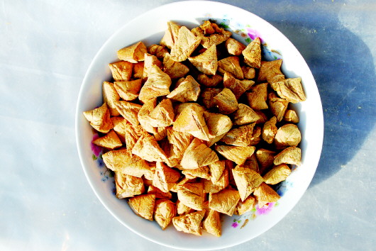 七十二行,釀酒、熬糖最繁瑣。香甜的麥芽糖,如同世間的其他事物一樣,都是通過勞苦換來的,正所謂苦盡甘來。田新民做灶糖用的是麥芽糖,首先要將原料小麥浸泡生芽,然后生成麥芽,不過有了麥芽,還要經(jīng)過多道工序才能變成麥芽糖。通常泡發(fā)麥芽之后,接下來就是蒸制配料,要依次進(jìn)行碾米、浸泡籠蒸、擠糖汁、二次籠蒸,再用力將麥芽搗碎,拌入蒸熟的黃米裝缸,加開水浸泡,淋出第一遍糖汁,再加開水淋出第二遍糖汁。然后再把兩次淋出的糖汁,倒至鐵鍋內(nèi)加小火,用木锨或木棒攪動,使水分蒸發(fā)凝結(jié)成固體,最終即得麥芽糖。熬糖要反復(fù)三次,經(jīng)過六個小時才能成功。田新民說:“這樣熬出來的糖,密封好后,埋在地下很多年都不會壞。”