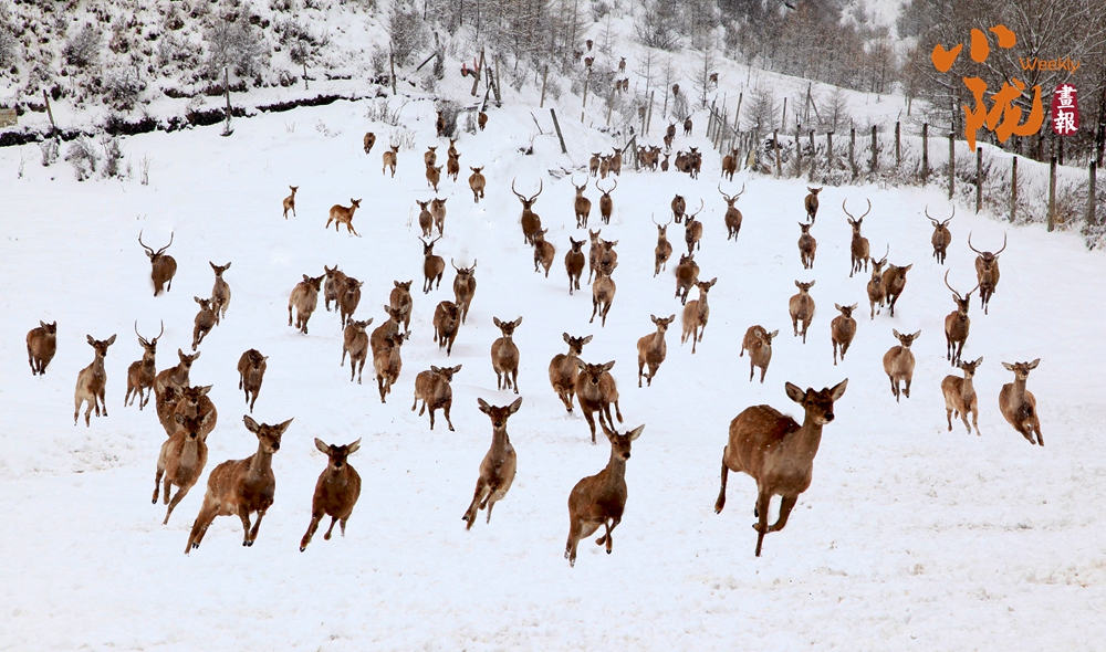 雪滿山川,素白沉靜。關(guān)灘溝鹿場的梅花鹿,在躲了一夜的風(fēng)雪后成群結(jié)隊(duì)出來,或是雪中覓食,或是雪中撒歡,它們活潑的嬉戲好一幅祥和畫面。