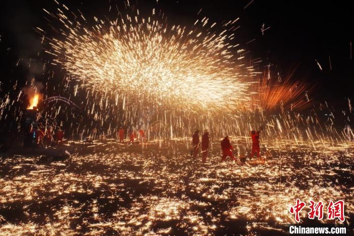 永靖王氏鑄造技藝傳承人在永靖黃河岸邊表演了國家級非物質(zhì)文化遺產(chǎn)“打鐵花”,讓民眾享受了一場視覺盛宴。侯奇志 攝