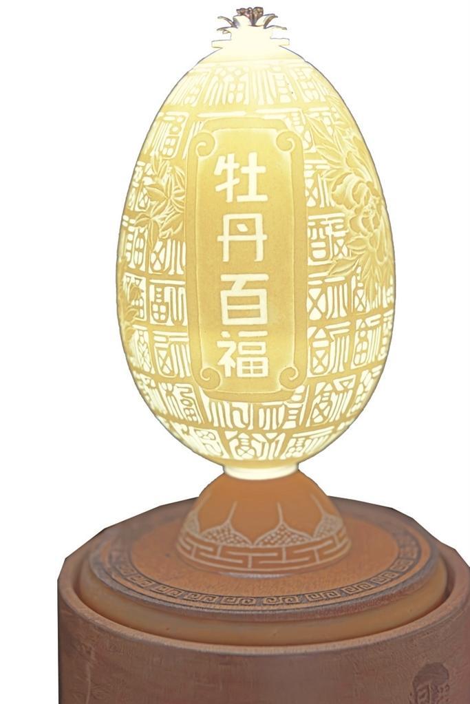 楊星國(guó)雕刻過(guò)的作品達(dá)兩千多件,作品《牡丹亭》是他用最新的拼雕手法創(chuàng)作的,鴕鳥(niǎo)蛋殼細(xì)分成300片,打磨成“瓦片”樣,逐片貼成古建筑中亭頂蓋狀,形成牡丹亭之樣,做成外層的“亭”;內(nèi)層的“牡丹”則用鴯鹋蛋殼,利用其自然色,依照牡丹層層雕透,第一層深墨、第二層墨綠、第三層淡綠、第四層白色從外到內(nèi)雕刻,作品既有國(guó)畫(huà)的神韻又有雕刻的立體藝術(shù)之美。浮雕、陰雕、陽(yáng)雕、鏤空雕、拼雕等手法,在《牡丹亭》作品里全部顯現(xiàn)。為了讓作品表達(dá)的效果更充分,楊星國(guó)又加了一些機(jī)械原理讓其旋轉(zhuǎn),還加了燈光,于是,3個(gè)鴕鳥(niǎo)蛋殼與1個(gè)鴯鹋蛋殼在楊星國(guó)的巧妙構(gòu)思中有了全新的生命。