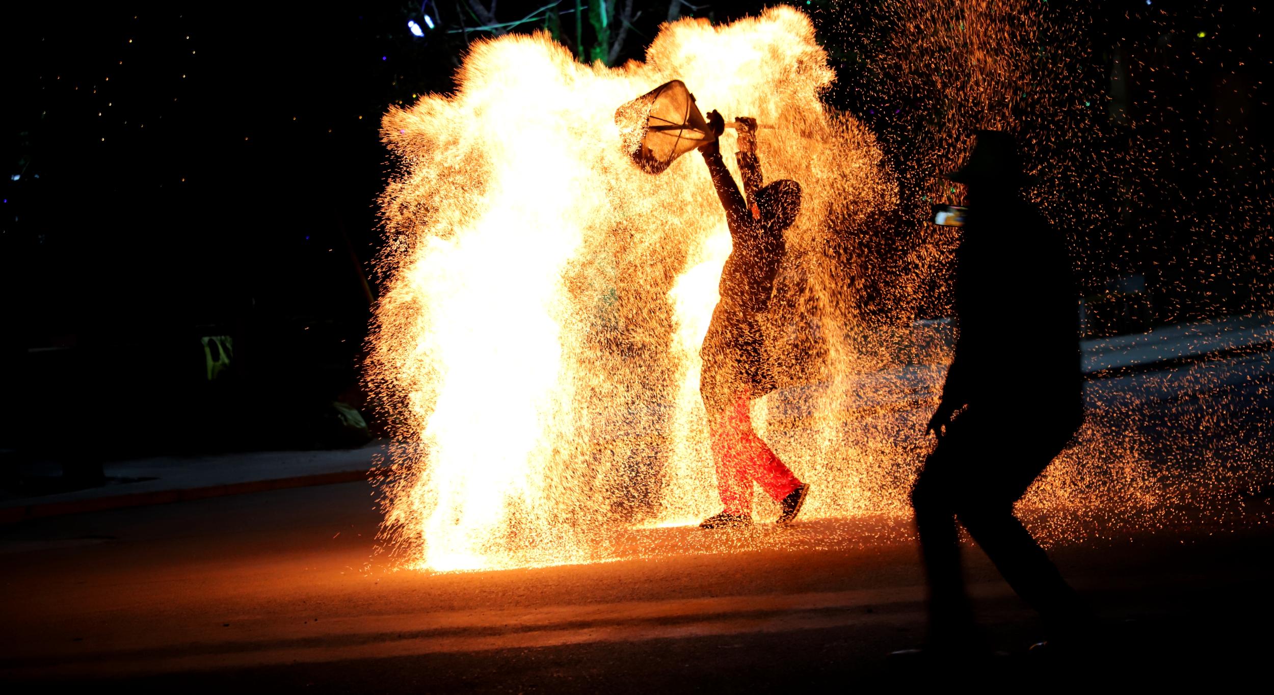 活動(dòng)現(xiàn)場,鐵花飛濺,流星如瀑?,F(xiàn)場火樹銀花璀璨奪目,絢爛的鐵花在空中綻放,令人驚艷。專業(yè)打花人將近1500多攝氏度的高溫鐵汁用力擊打,化為火樹銀花,在空中形成鐵花,四處飛濺,放眼望去,一串串耀眼的鐵花在空中散開,猶如煙花綻放,又似流星滑落,繪就“鐵樹銀花落,萬點(diǎn)星辰開”的美景。