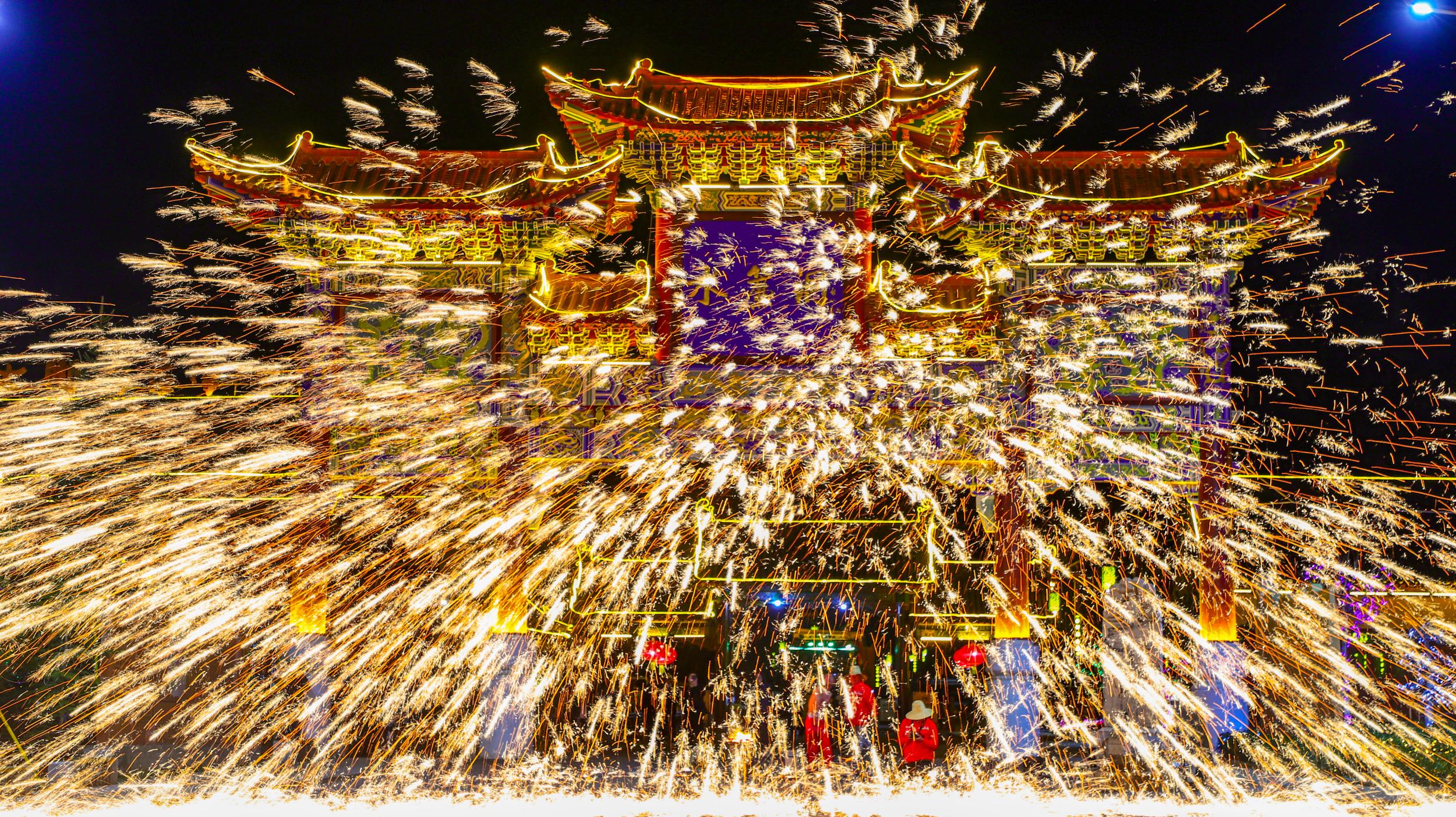 璀璨奪目的鐵花在空中綻放,場面十分壯觀。民眾在火樹銀花、星光璀璨之間感受著濃濃的中國傳統(tǒng)民俗文化。