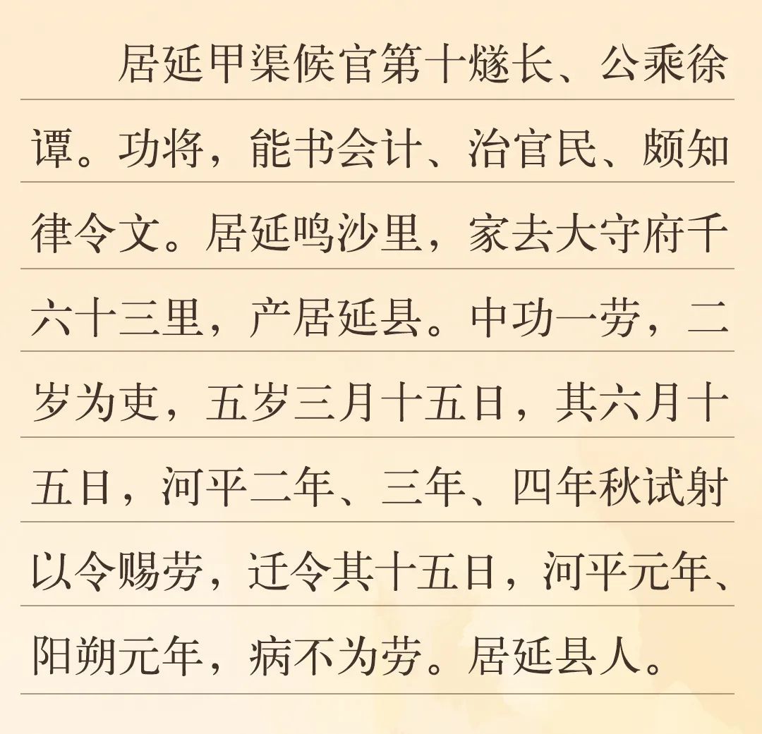 此簡(jiǎn)1972年出土于破城子甲渠候官遺址,分三段書寫。內(nèi)容為居延甲渠候官第十燧長(zhǎng)徐譚的功將文書。“功將”即“功勞墨將”,功勞墨將文書指官吏個(gè)人才能與勞績(jī)的登記名單,是官方對(duì)官吏功勞下發(fā)的認(rèn)定通知。