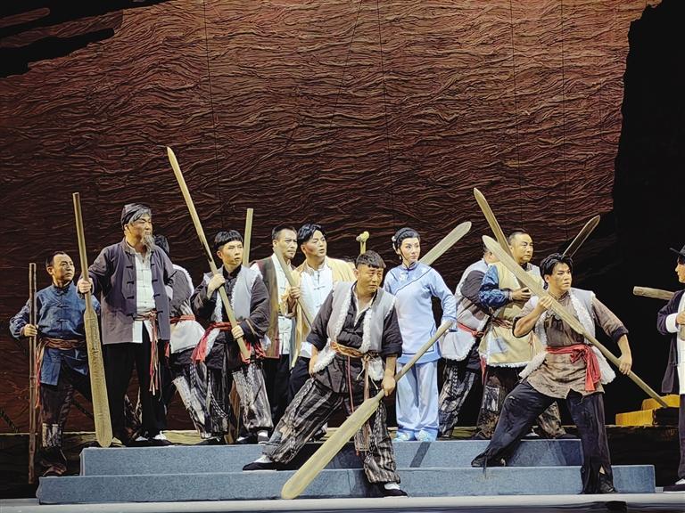 中國甘肅網(wǎng)5月21日訊 據(jù)蘭州晚報(bào)報(bào)道(記者 高宏梅 文/圖)酣暢淋漓的“花兒”唱出了黃河兒女的人間悲喜,韻味濃厚的“嘛簧”一唱眾幫,隴劇戲曲張力無限,“羊皮筏子賽軍艦”的熱血故事成就走心之作……5月19日晚,國家藝術(shù)基金資助項(xiàng)目原創(chuàng)隴劇《大河?xùn)|流》在黃河劇院成功首演,隴劇“梅花獎(jiǎng)”甘當(dāng)配角,“青春力量”首挑大梁,出新出彩的優(yōu)異表現(xiàn)贏得滿堂彩。