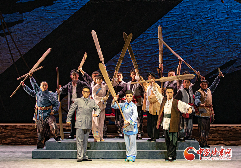 隴劇《大河?xùn)|流》于19日晚在甘肅黃河劇院成功首演。該劇以20世紀(jì)30年代末抗戰(zhàn)為背景,運用具有地方特色的隴劇形式,生動地描繪了大西北黃河邊的一群筏客子在國家危難之際,如何放下個人恩怨,團(tuán)結(jié)起來支援抗戰(zhàn),組成水上大型運輸隊,將大量物資安全送達(dá)抗戰(zhàn)前線,創(chuàng)造了“羊皮筏子賽軍艦”的傳奇故事。(甘肅省隴劇院供圖)
