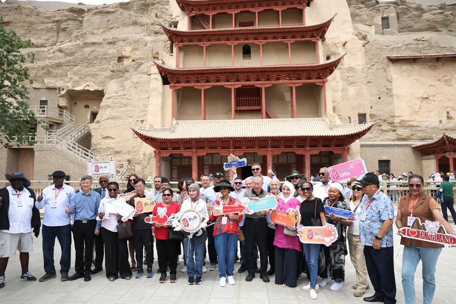 6月6日至8日,來自22個國家的駐華使節(jié)和高級別外交官走進敦煌,尋訪莫高窟,游覽鳴沙山月牙泉景區(qū),參加河西走廊五市的文旅專場推介會,并在對話會上共同探討“絲路精神推動文明交流互鑒”。