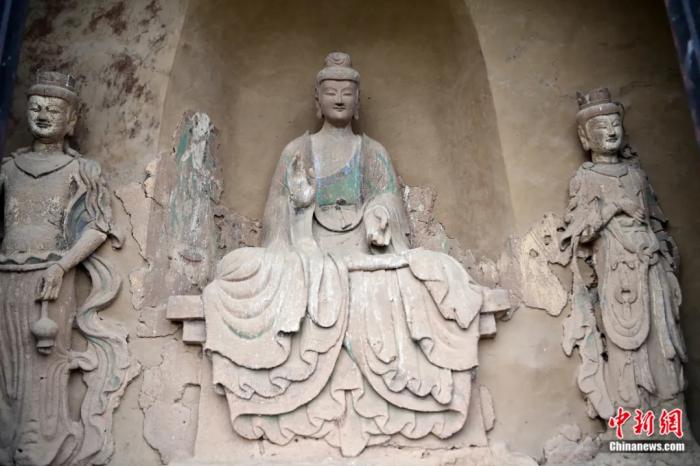 麥積山石窟第44窟的西魏泥塑一佛二菩薩組像。主尊佛像被譽(yù)為“東方美人”。九美旦增 攝
