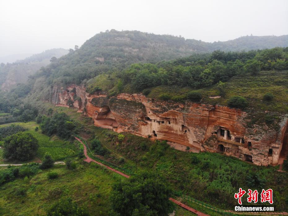 7月15日,航拍甘肅省平?jīng)鍪袥艽h百里石窟長廊中的羅漢洞石窟。百里石窟長廊位于涇川縣境內(nèi),由512個石窟、5眼窟中石井組成,現(xiàn)存王母宮石窟、鳳凰山石窟、南石窟寺、丈八寺石窟、羅漢洞石窟、太山寺石窟等規(guī)模較大的石窟群,還有數(shù)量眾多的小石窟群。羅漢洞石窟遺存40余個窟龕,以北魏至清代風(fēng)格為主。(無人機(jī)照片) 中新社記者 李亞龍 攝