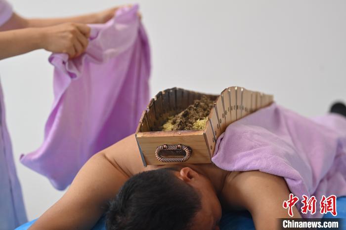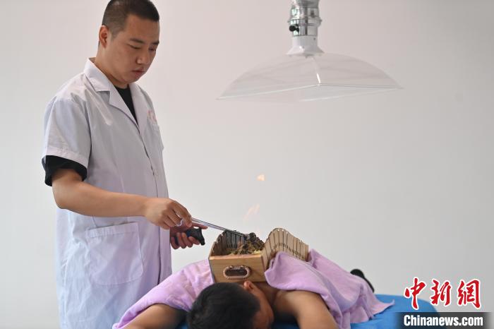7月16日,甘肅省平?jīng)鍪徐`臺縣皇甫謐針灸康養(yǎng)館內(nèi),工作人員對患者進行火龍灸治療。2006年,靈臺皇甫謐針灸術(shù)入選第一批甘肅省非物質(zhì)文化遺產(chǎn)名錄。靈臺作為皇甫謐故里,當?shù)孛癖姺浅UJ可中醫(yī)康養(yǎng),針灸、拔火罐、推拿、葫蘆灸、火龍灸(督脈灸)等中醫(yī)特色療法受到了很多人的青睞,當?shù)毓俜揭餐ㄟ^舉辦大型節(jié)會等助推中醫(yī)康養(yǎng)產(chǎn)業(yè)發(fā)展。 皇甫謐是針灸醫(yī)學鼻祖,其《針灸甲乙經(jīng)》已在多個國家被廣泛傳播應用。中新社記者 李亞龍 攝