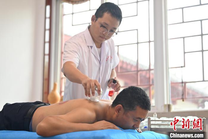 7月16日,甘肅省平?jīng)鍪徐`臺縣皇甫謐針灸康養(yǎng)館內(nèi),工作人員對患者進行拔火罐。2006年,靈臺皇甫謐針灸術(shù)入選第一批甘肅省非物質(zhì)文化遺產(chǎn)名錄。靈臺作為皇甫謐故里,當?shù)孛癖姺浅UJ可中醫(yī)康養(yǎng),針灸、拔火罐、推拿、葫蘆灸、火龍灸(督脈灸)等中醫(yī)特色療法受到了很多人的青睞,當?shù)毓俜揭餐ㄟ^舉辦大型節(jié)會等助推中醫(yī)康養(yǎng)產(chǎn)業(yè)發(fā)展。 皇甫謐是針灸醫(yī)學鼻祖,其《針灸甲乙經(jīng)》已在多個國家被廣泛傳播應用。  中新社記者 李亞龍 攝