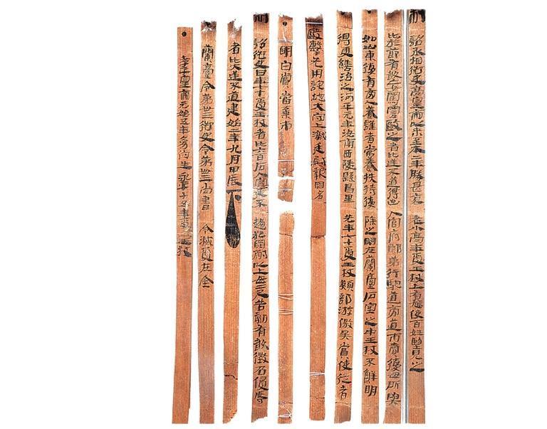 王杖簡,漢代,出土于武威市磨咀子漢墓。共計10枚,松木削制。兩道編繩,先書后編;墨書隸體,字跡清晰。每枚簡容字多者37字,少者6字,共240字。其內容記載了東漢永平十五年(72年)幼伯受王杖事,并錄建始二年(前31年)九月“年七十受王杖”的詔書與河平元年(前28年)毆擊王杖主當棄市的令。