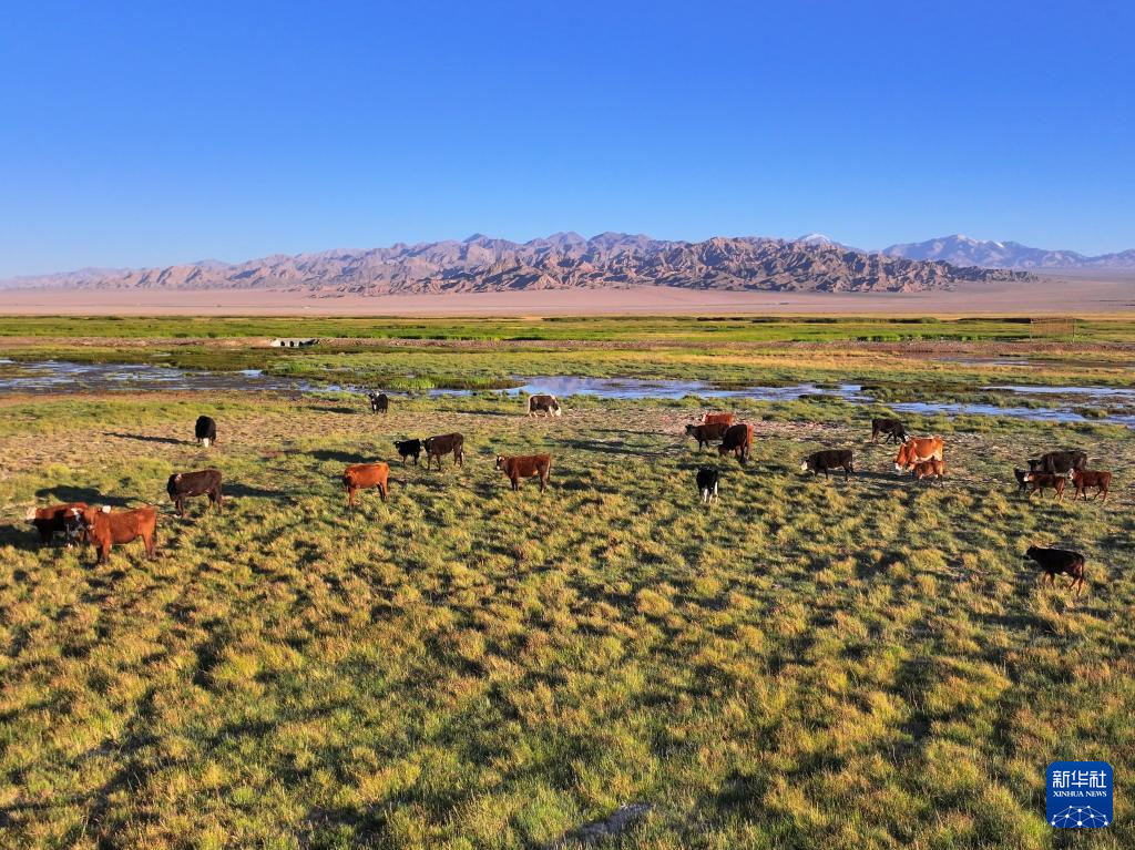 盛夏時節(jié),地處甘肅省酒泉市阿克塞哈薩克族自治縣阿伊納鄉(xiāng)境內(nèi)的大、小蘇干湖濕地,綠草如茵,牛羊成群,呈現(xiàn)出一幅生機(jī)勃勃的草原生態(tài)畫卷。