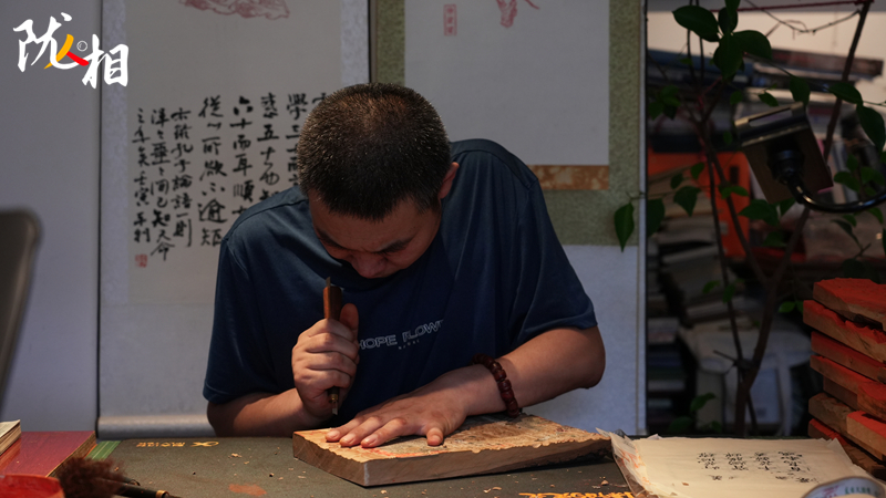 立秋前夕,在“脈望閣”書(shū)房里,安靜地只聽(tīng)見(jiàn)屏氣凝神的呼吸聲,專(zhuān)業(yè)的刻刀、常用的手工宣紙、幾塊梨木板,靜寧縣傳統(tǒng)雕版印刷非遺傳承人李安樂(lè)正一絲不茍地在有繪畫(huà)的梨木上進(jìn)行雕刻作品。