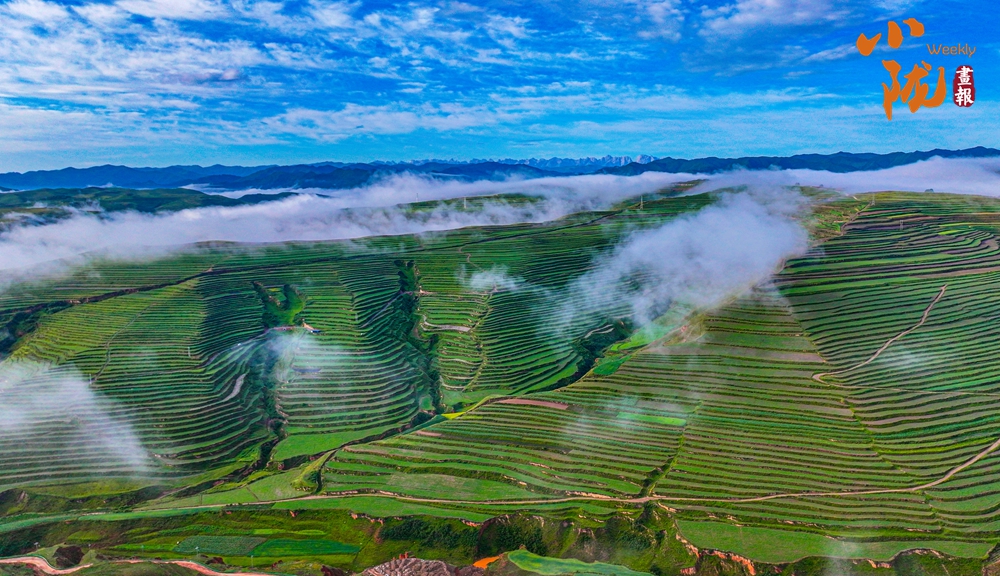 萬畝碧綠的梯田從山腳盤繞著直至山頂,高低錯落,層層疊疊伸向遠方,遠遠望去,像“條縷清晰”的調(diào)色板,在藍天白云的打扮下,壯現(xiàn)絢爛。