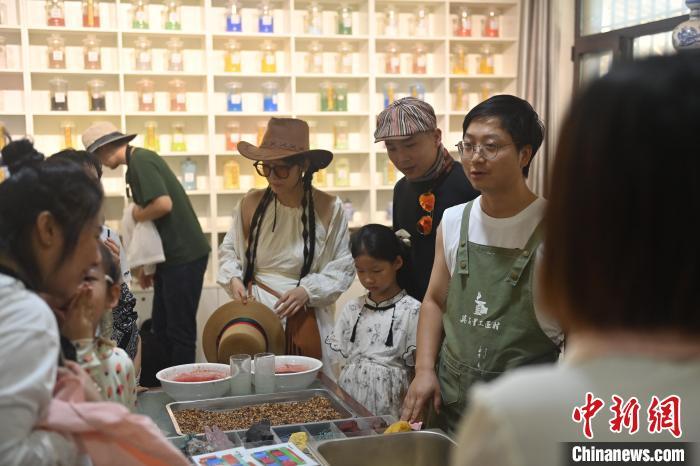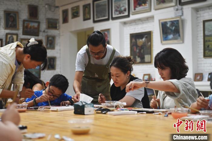 8月20日,甘肅敦煌莫高里工匠村內(nèi),研學(xué)導(dǎo)師向?qū)W員介紹敦煌礦物質(zhì)顏料。工匠村開設(shè)了泥板畫、彩繪、雕塑制作、剪紙、農(nóng)耕體驗等課程,現(xiàn)已發(fā)展成為一個集敦煌文化講堂、壁畫書法研習(xí)、美術(shù)設(shè)計、彩塑制作教學(xué)、篆刻藝術(shù)、傳統(tǒng)釀酒體驗、農(nóng)業(yè)產(chǎn)業(yè)發(fā)展等于一體的多功能實訓(xùn)基地。中新社記者 李亞龍 攝