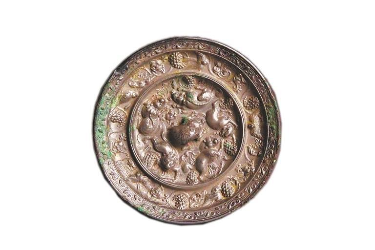 我省天水市博物館的眾多藏品中,有一面海獸葡萄紋銅鏡,大致出現(xiàn)于武則天執(zhí)政時(shí)期(684年—705年)。銅鏡上五只瑞獸作匍匐狀,攀援著葡萄枝蔓,這里的海獸就是來(lái)自西域的獅子,古人稱(chēng)為“狻猊”。此外鏡上葡萄藤葉鋪陳、點(diǎn)綴著禽鳥(niǎo)和卷草,精美絕倫,彰顯著大唐開(kāi)放包容的盛世氣象。