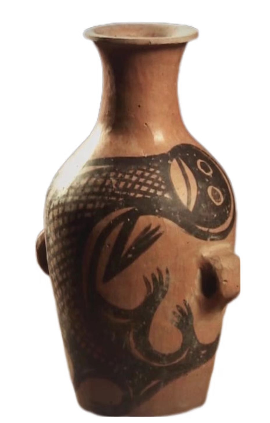 這件鯢魚(yú)紋彩陶瓶為泥質(zhì)紅陶,高18.5厘米,口徑寬5.7厘米,底徑7厘米,腹徑14厘米,重430克。陶瓶最顯著的特征是在腹部繪有動(dòng)物圖紋。動(dòng)物的身子呈蜷曲狀,尾巴向上翹舉,交于頭上。臉?biāo)迫嗣妫p眼圓睜而有神。嘴巴寬闊,顎下有須,頭頂兩側(cè)有伸出的節(jié)肢狀腮。奇怪的是,它只有一對(duì)前肢,肢端有張開(kāi)的四肢。陶瓶身上繪制有網(wǎng)格狀的線紋。線條流利而生動(dòng),變化豐富,展現(xiàn)出了熟練自如的繪畫(huà)技巧。從鯢魚(yú)圖案的繪制來(lái)看,紋飾用筆鋒畫(huà)作的線條遒勁有力,頓挫有致。粗細(xì)不同的線條之間,還凸顯出了圖紋部位的主次。彩陶的出現(xiàn),也似乎在見(jiàn)證著先祖?zhèn)冊(cè)谑庝离x居、不常厥邑的歲月中所經(jīng)歷的那些艱難生活。