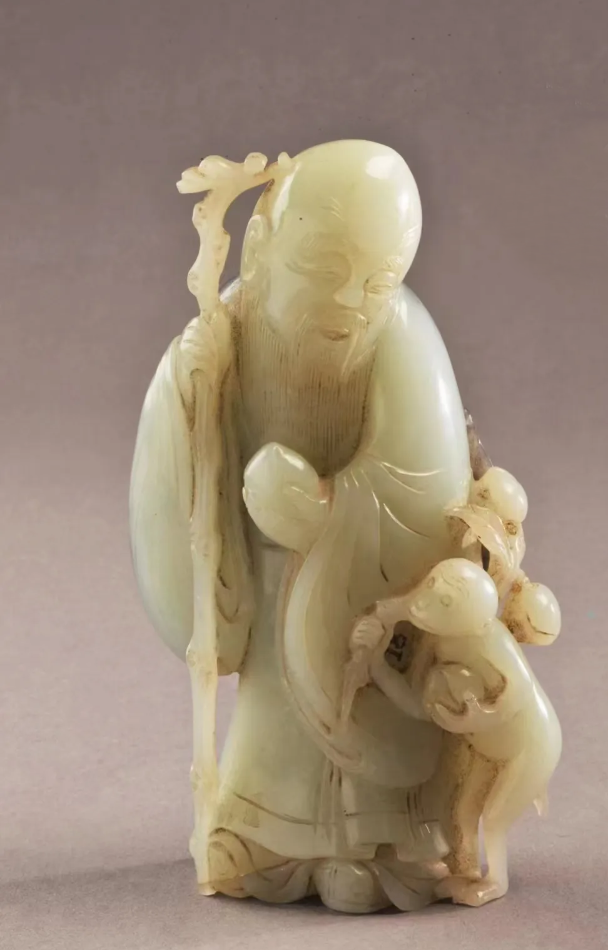 玉壽星,清代,高15.5厘米,寬9厘米,厚4.7厘米。用整塊和田青白籽料琢制,正面玉質(zhì)潔白溫潤(rùn),背部有黑灰泌色。壽星頭微左傾,桃額,慈目善眉,大耳長(zhǎng)頸,著廣袖大袍,左手持壽桃,右手持龍首杖,袍下微露云頭履。左側(cè)有一躬身站立猴子,左臂抱一壽桃,右肩扛桃枝。玉雕為俏色雕刻而成,融圓雕、線刻、透雕等手法,將壽星的慈祥和小猴子的可愛(ài)表現(xiàn)于一體。