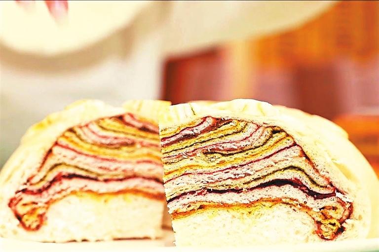 母親最拿手的還是做千層大月餅,做法與平常做饃有點(diǎn)不一樣,發(fā)好面后取適量揉好,切成同樣大小的若干份并搟壓成長方形的薄面皮。一層薄皮一層餡,餡料與烙的糖饃有的不一樣,重在色澤,每層分別抹上姜黃、紅曲、苦豆(香豆)粉、芝麻、菜籽油、糖玫瑰、葡萄干,黃、紅、黑、綠相間,一層黃一層綠一層紅一層黑,一層白糖一層紅糖一層玫瑰糖,一層一層摞好,做成一個(gè)六七層的圓餅。最后用薄皮蓋住一摞摞面皮,餅邊捏緊捏好后壓花塑形,表面用模型壓花,用專用做飯梳子一行行點(diǎn)上,或一行白鷺上青天,面皮如一塊畫布,精雕細(xì)琢,怎么好看怎么做,做得隨心所欲又精心設(shè)計(jì)。還會(huì)刷姜黃與菜籽油拌好的油料,撒上芝麻粒和葡萄干,一個(gè)千層餅就基本成型了。
