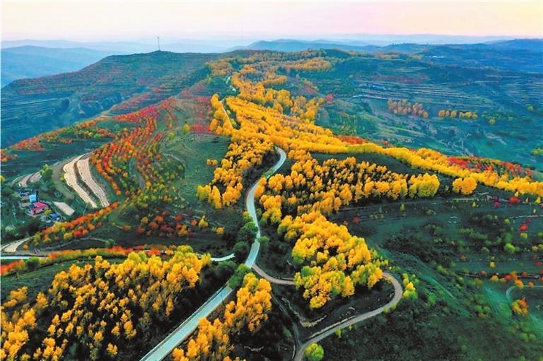 金秋時(shí)節(jié),這里秋葉五彩繽紛,黃得如金,綠得如玉,紅得如火,把秋姑娘打扮得格外妖嬈。一陣涼風(fēng)拂過(guò),金黃的樹(shù)葉,搖曳著一把把小扇子,從空中飄飄而下,似乎在訴說(shuō)著一個(gè)美麗的童話(huà)。村落散落在綿延數(shù)里的山腳下,村前屋后金色圍繞,梯田如鏈似帶、穿插交錯(cuò),如一幅幅線(xiàn)條簡(jiǎn)潔明快的木刻版畫(huà)。