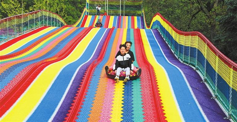 10月2日,游客在隴南市武都區(qū)五馬“網(wǎng)紅”童話小鎮(zhèn)體驗彩虹滑道。新甘肅·甘肅日報通訊員 李旭春